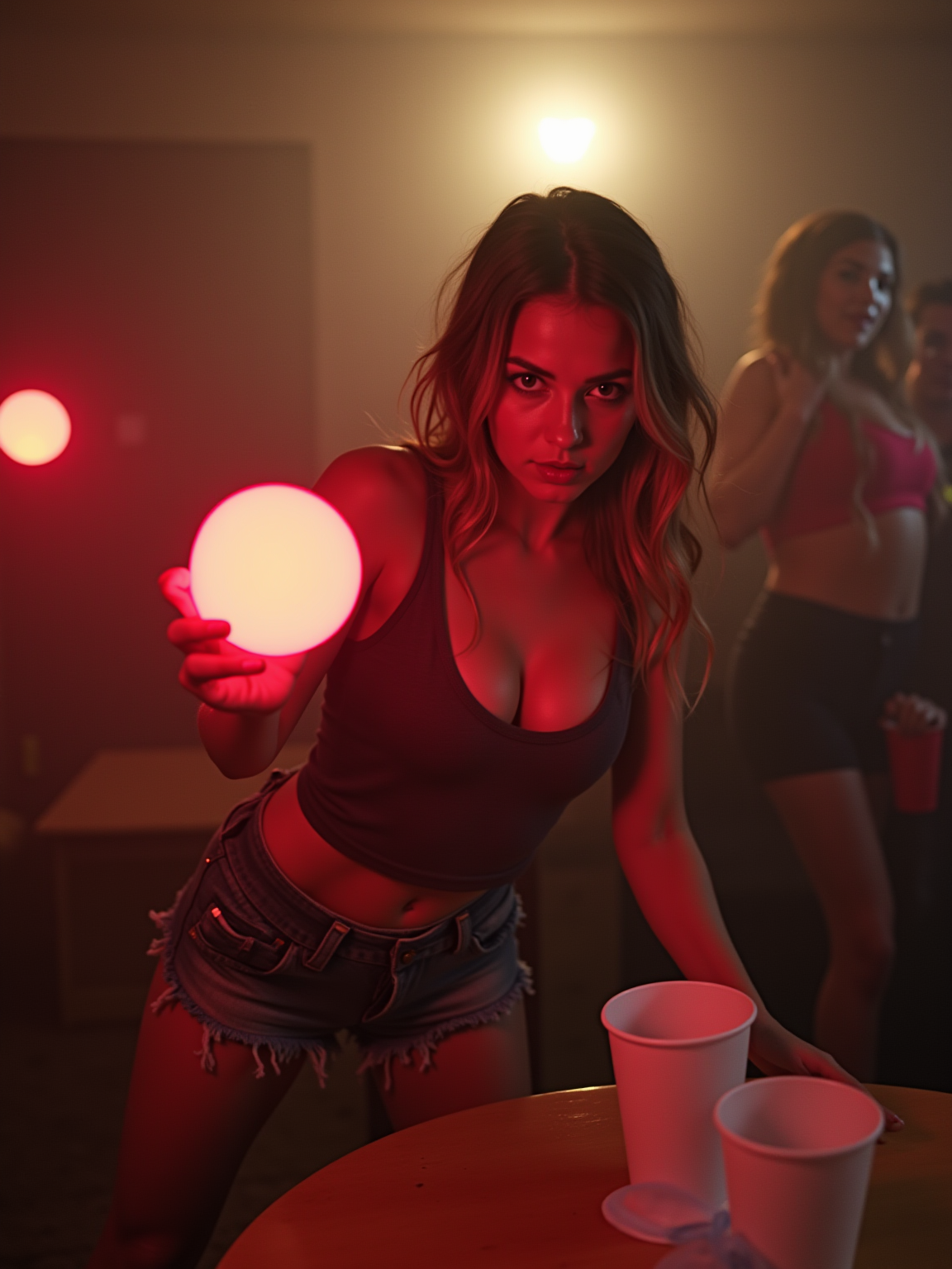 camera flash overexposed, model playing beer pong in a crowded living room. Wearing a tight tank top, mid-throw, focused and sexy, playful competition . Flash-lit, party game, fun chaos.
