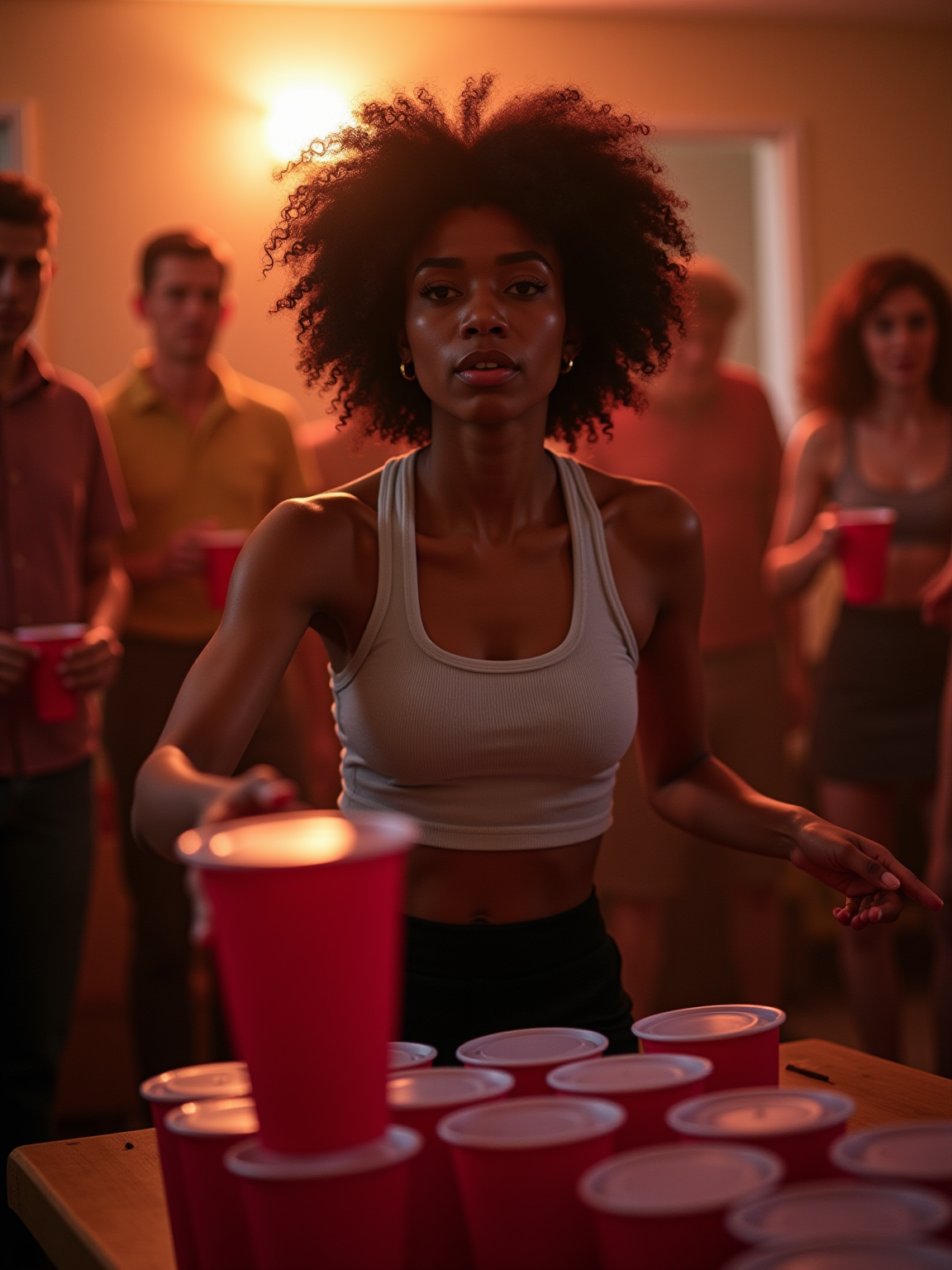 camera flash overexposed, model playing beer pong in a crowded living room. Wearing a tight tank top, mid-throw, focused and sexy, playful competition . Flash-lit, party game, fun chaos.
