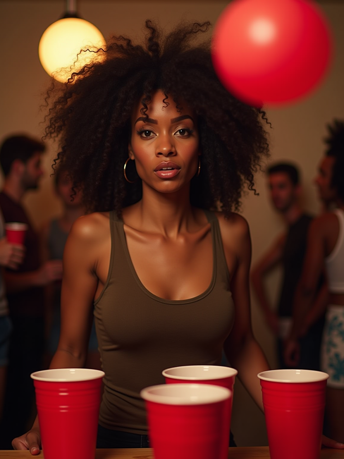 camera flash overexposed, model playing beer pong in a crowded living room. Wearing a tight tank top, mid-throw, focused and sexy, playful competition . Flash-lit, party game, fun chaos.