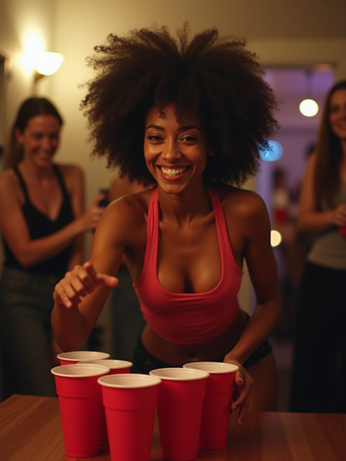 camera flash overexposed, model playing beer pong in a crowded living room. Wearing a tight tank top, mid-throw, focused and sexy, playful competition . Flash-lit, party game, fun chaos.