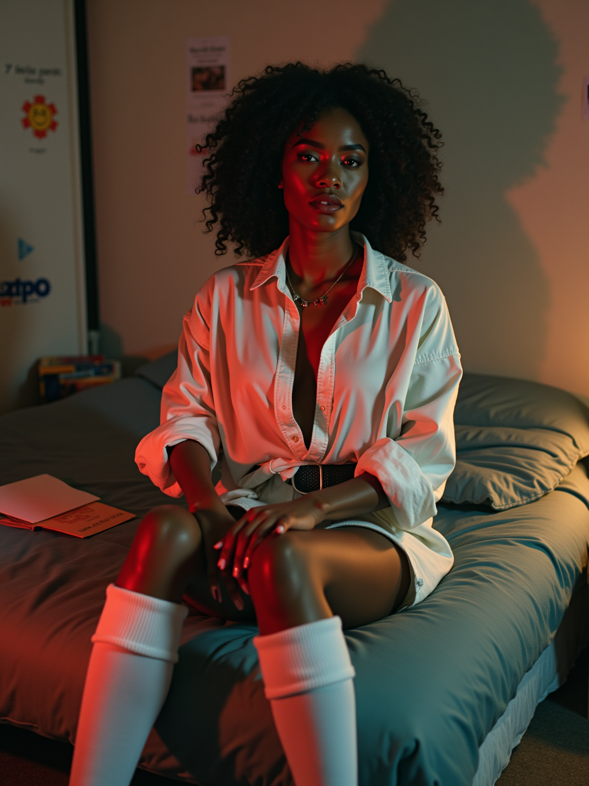 camera flash overexposed, model posing in a cluttered bedroom with posters on the wall. Wearing oversized band shirt, knee-high socks, shirt slipping off shoulder, sexy and playful . Flash highlights, personal space, nostalgic feel.