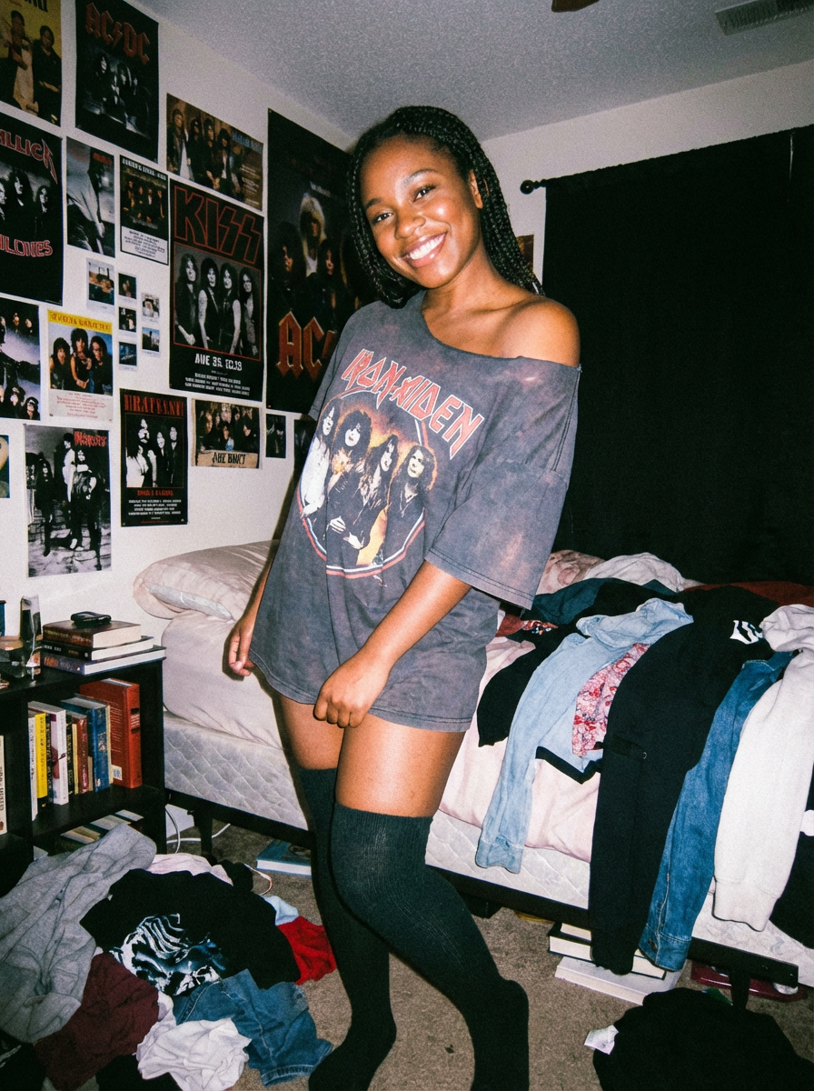camera flash overexposed, model posing in a cluttered bedroom with posters on the wall. Wearing oversized band shirt, knee-high socks, shirt slipping off shoulder, sexy and playful . Flash highlights, personal space, nostalgic feel.