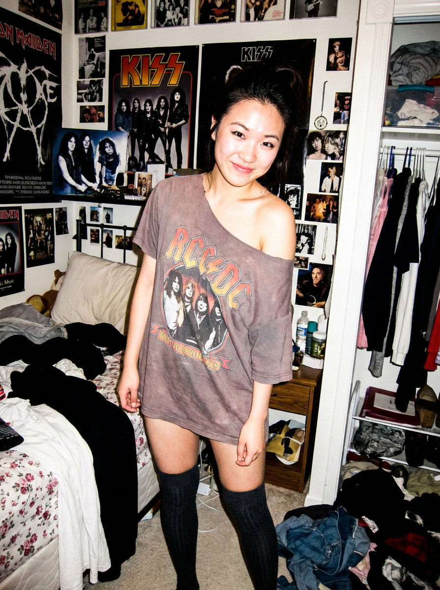 camera flash overexposed, model posing in a cluttered bedroom with posters on the wall. Wearing oversized band shirt, knee-high socks, shirt slipping off shoulder, sexy and playful . Flash highlights, personal space, nostalgic feel.