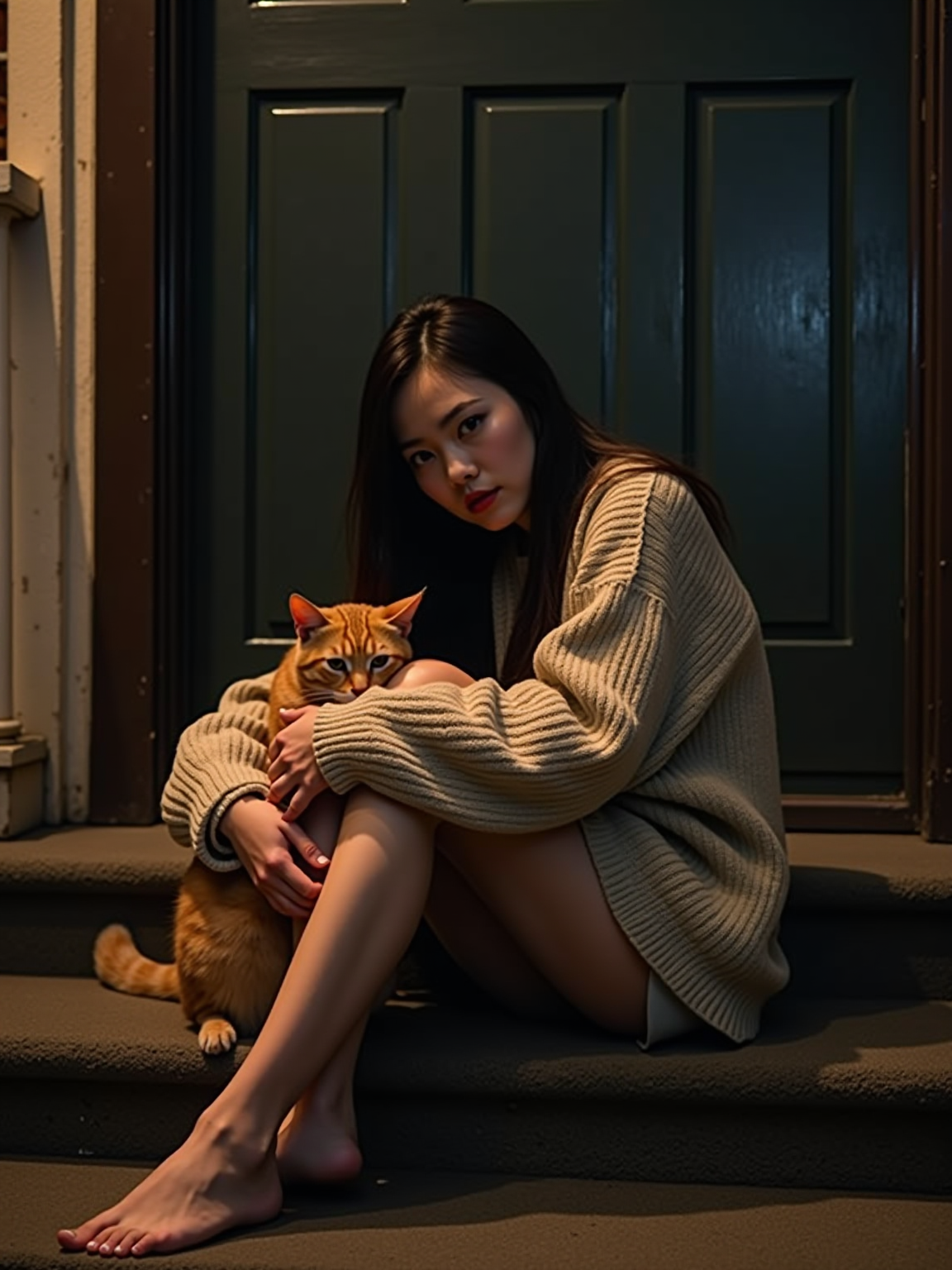 camera flash overexposed, model sitting on a porch step with a stray cat at night. Wearing oversized sweater, petting cat, sweater slipping off shoulder, sexy and cozy . Flash-lit, quiet night, unexpected company.