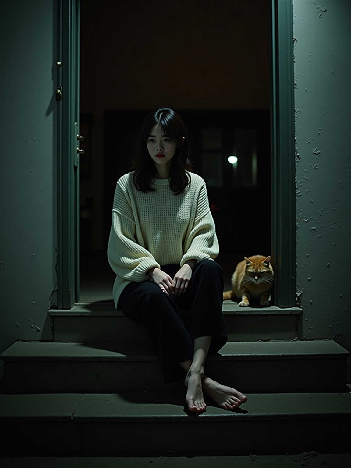 camera flash overexposed, model sitting on a porch step with a stray cat at night. Wearing oversized sweater, petting cat, sweater slipping off shoulder, sexy and cozy . Flash-lit, quiet night, unexpected company.