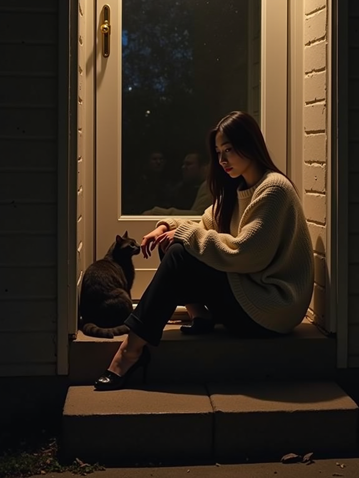 camera flash overexposed, model sitting on a porch step with a stray cat at night. Wearing oversized sweater, petting cat, sweater slipping off shoulder, sexy and cozy . Flash-lit, quiet night, unexpected company.