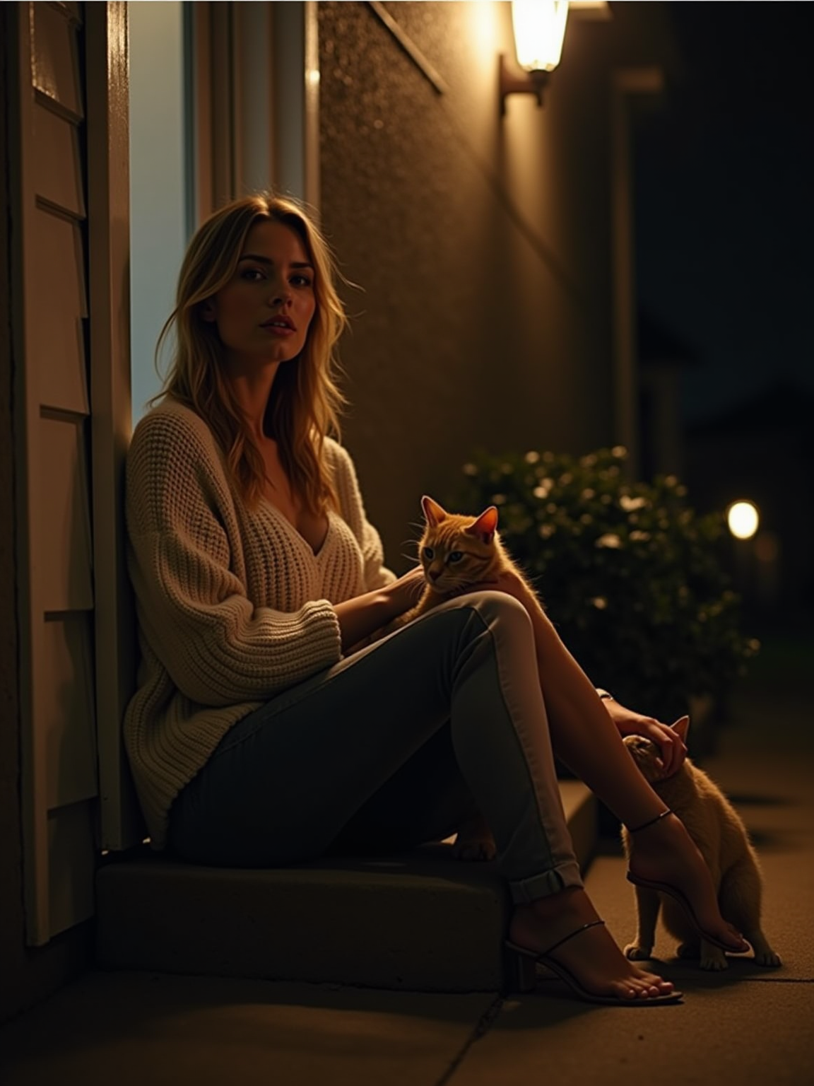 camera flash overexposed, model sitting on a porch step with a stray cat at night. Wearing oversized sweater, petting cat, sweater slipping off shoulder, sexy and cozy . Flash-lit, quiet night, unexpected company.