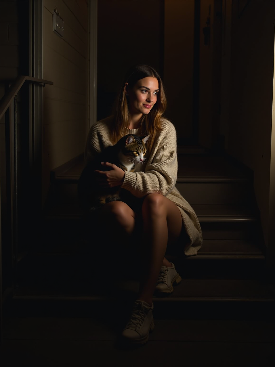camera flash overexposed, model sitting on a porch step with a stray cat at night. Wearing oversized sweater, petting cat, sweater slipping off shoulder, sexy and cozy . Flash-lit, quiet night, unexpected company.