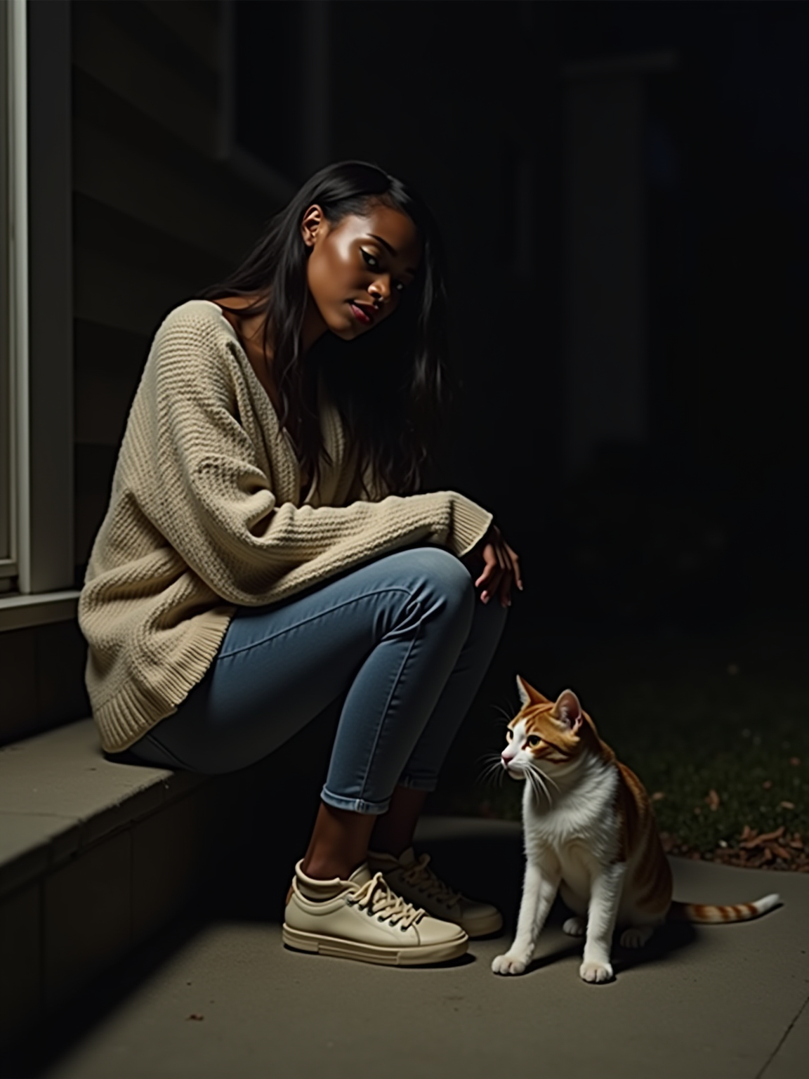 camera flash overexposed, model sitting on a porch step with a stray cat at night. Wearing oversized sweater, petting cat, sweater slipping off shoulder, sexy and cozy . Flash-lit, quiet night, unexpected company.