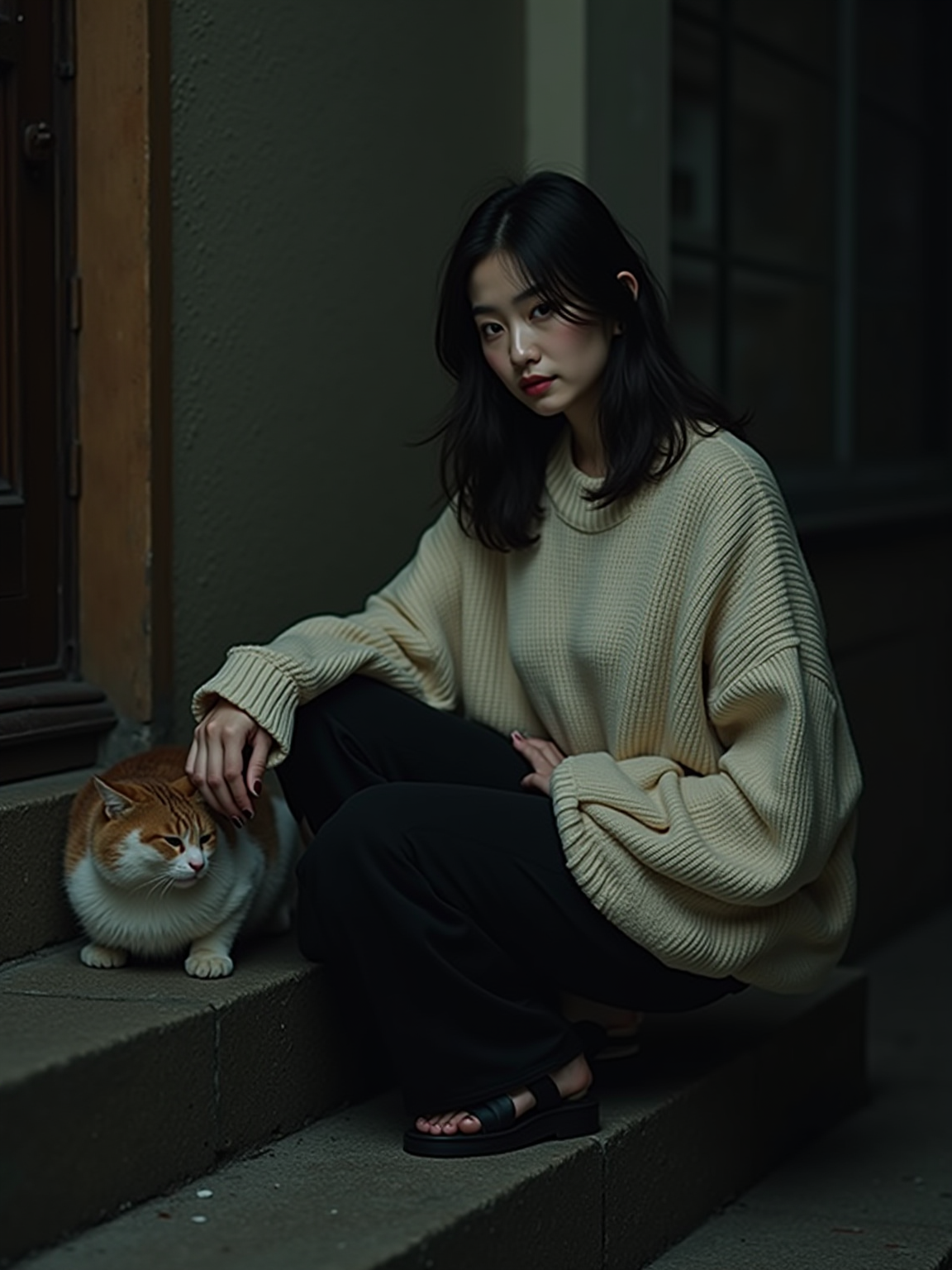camera flash overexposed, model sitting on a porch step with a stray cat at night. Wearing oversized sweater, petting cat, sweater slipping off shoulder, sexy and cozy . Flash-lit, quiet night, unexpected company.