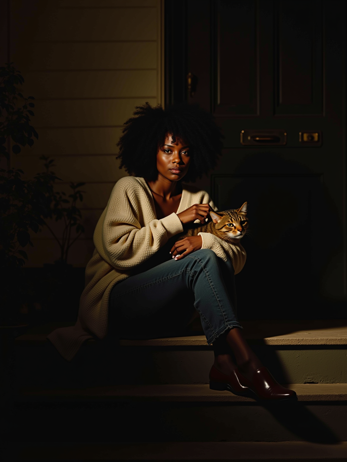 camera flash overexposed, model sitting on a porch step with a stray cat at night. Wearing oversized sweater, petting cat, sweater slipping off shoulder, sexy and cozy . Flash-lit, quiet night, unexpected company.