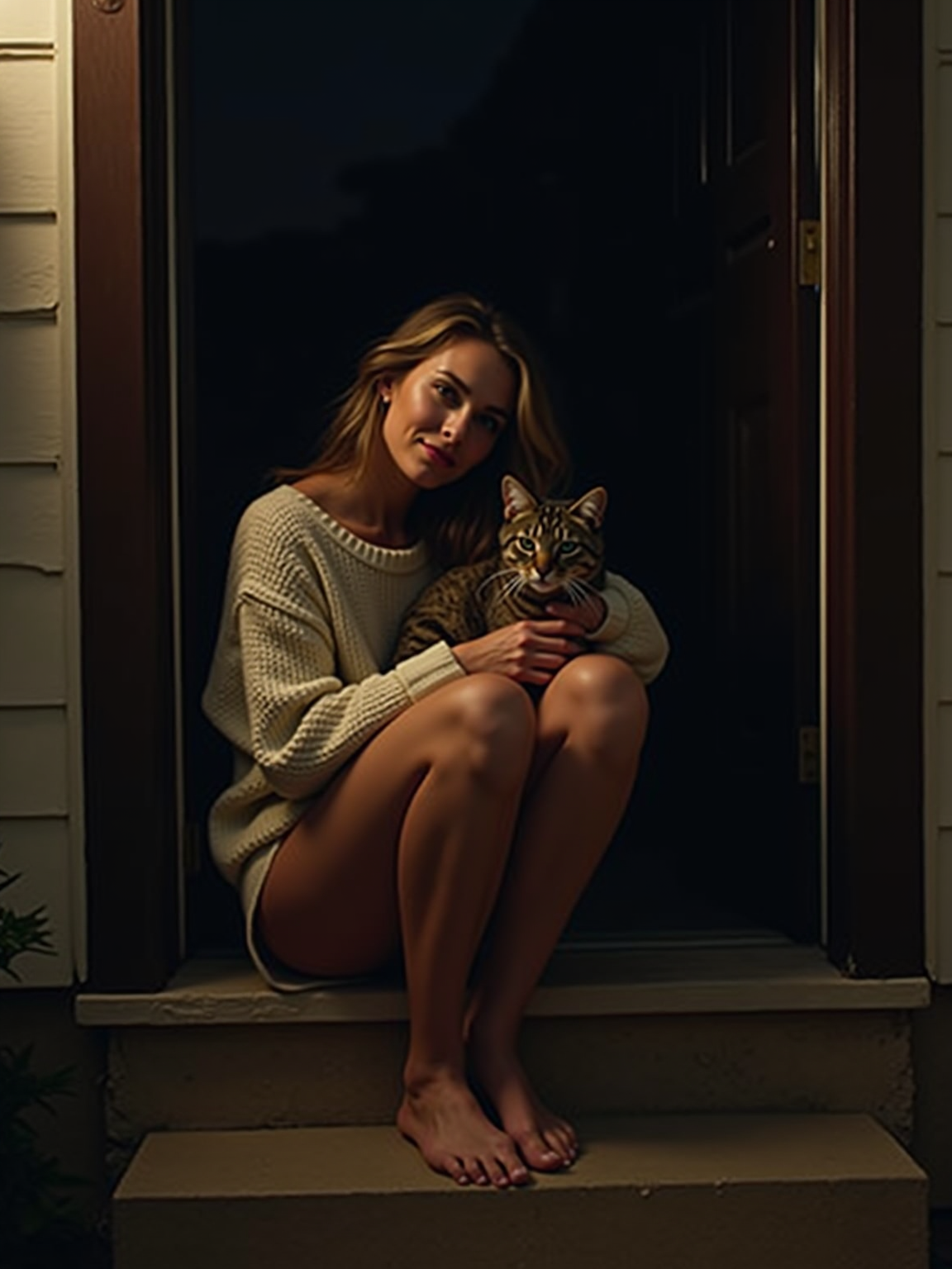 camera flash overexposed, model sitting on a porch step with a stray cat at night. Wearing oversized sweater, petting cat, sweater slipping off shoulder, sexy and cozy . Flash-lit, quiet night, unexpected company.