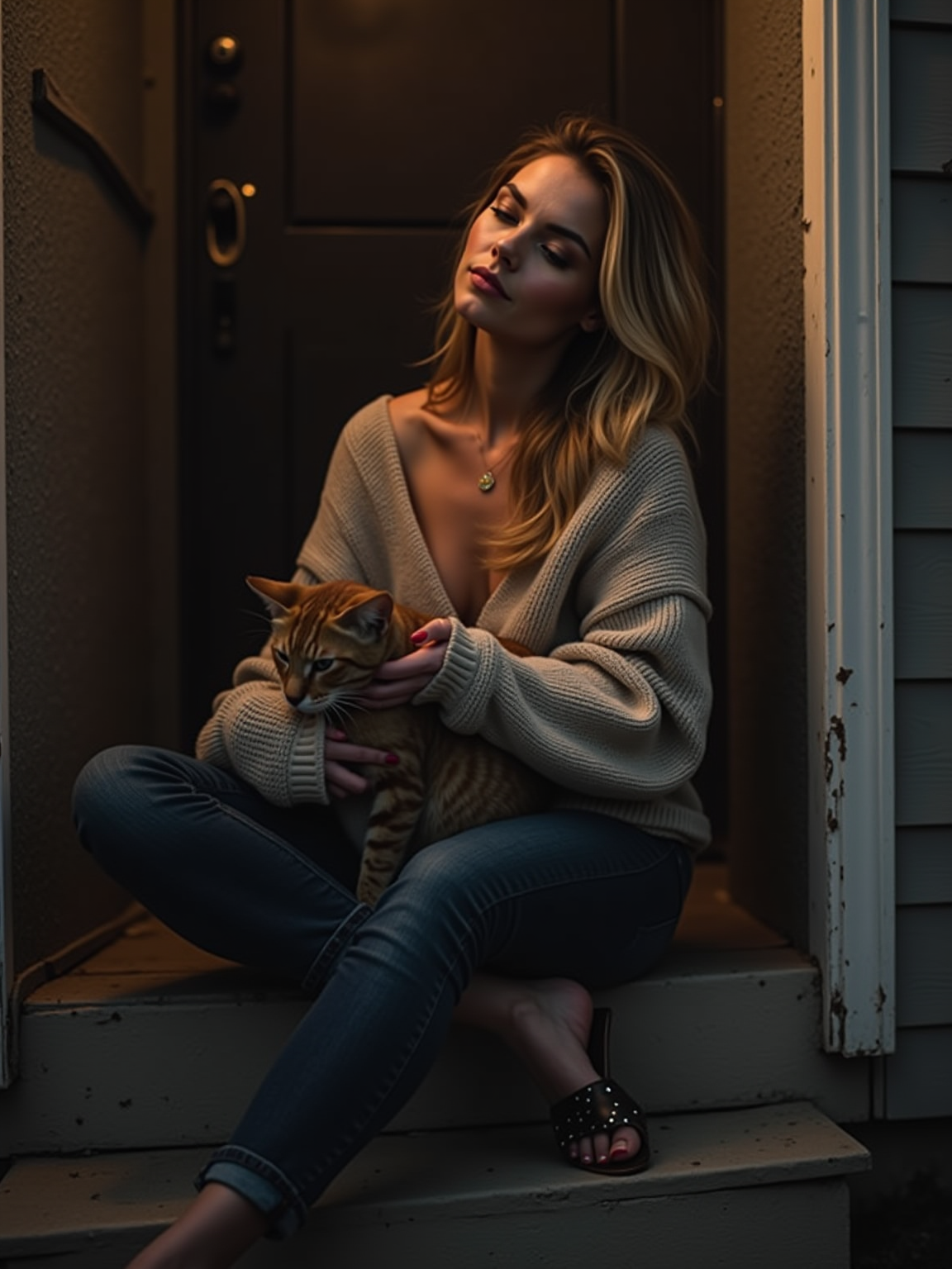 camera flash overexposed, model sitting on a porch step with a stray cat at night. Wearing oversized sweater, petting cat, sweater slipping off shoulder, sexy and cozy . Flash-lit, quiet night, unexpected company.