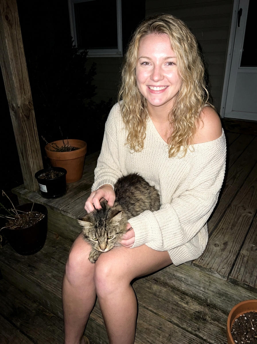 camera flash overexposed, model sitting on a porch step with a stray cat at night. Wearing oversized sweater, petting cat, sweater slipping off shoulder, sexy and cozy . Flash-lit, quiet night, unexpected company.