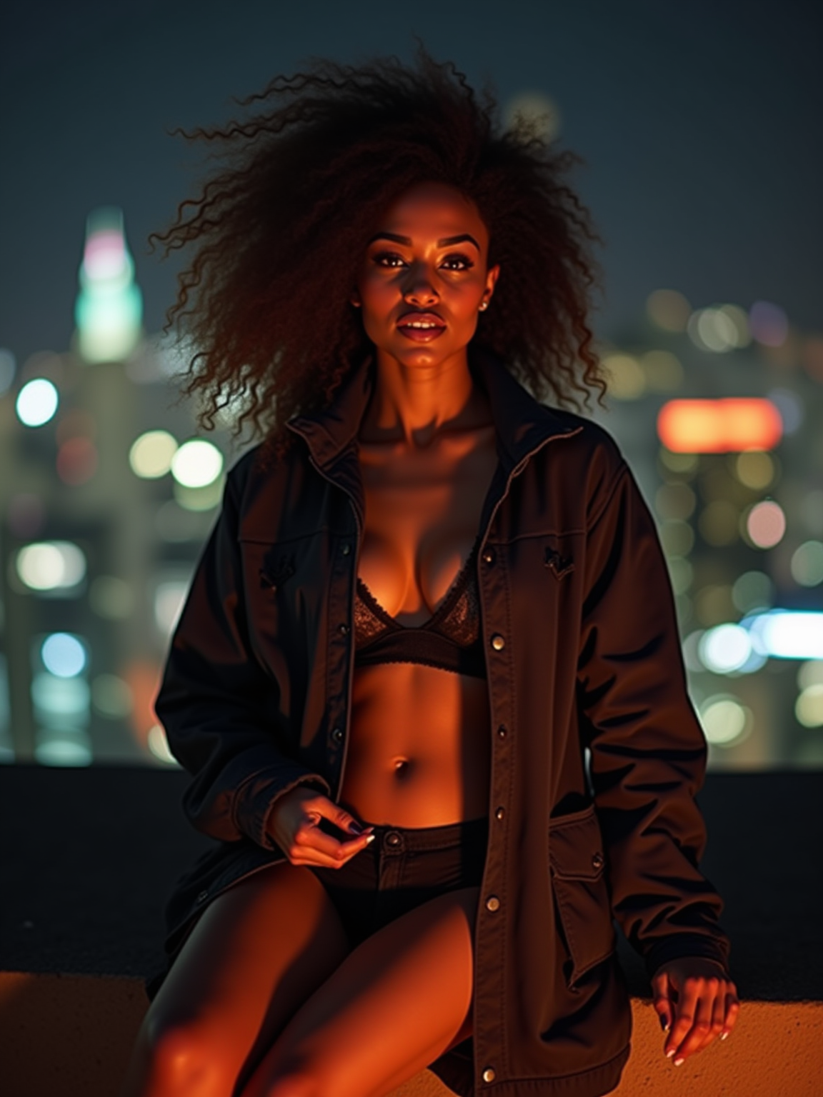 camera flash overexposed, model sitting on a rooftop at night, city lights in background. Wearing a windbreaker over lingerie, hair blowing, sexy and adventurous . Flash foreground, city bokeh, urban adventure.