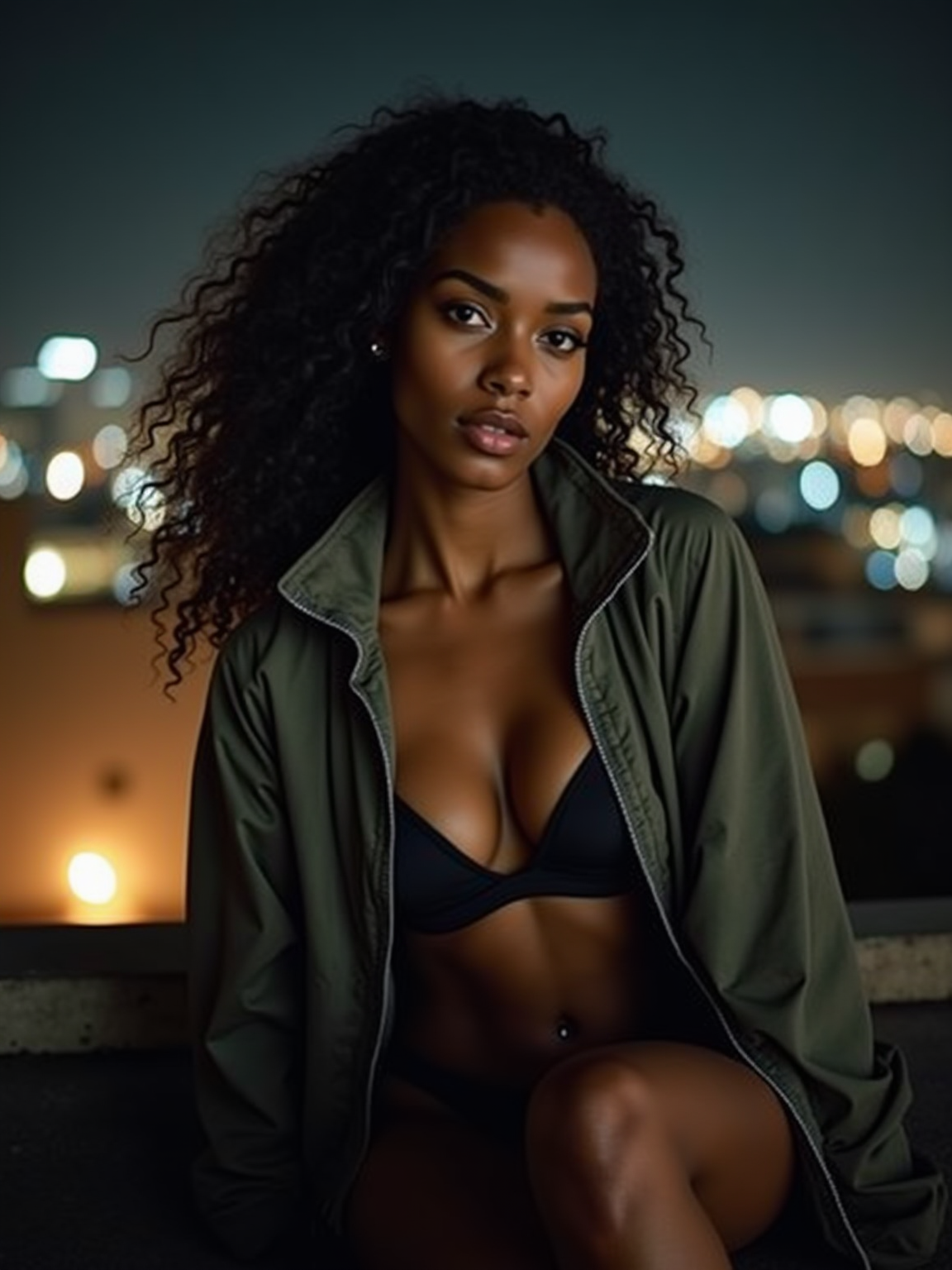 camera flash overexposed, model sitting on a rooftop at night, city lights in background. Wearing a windbreaker over lingerie, hair blowing, sexy and adventurous . Flash foreground, city bokeh, urban adventure.