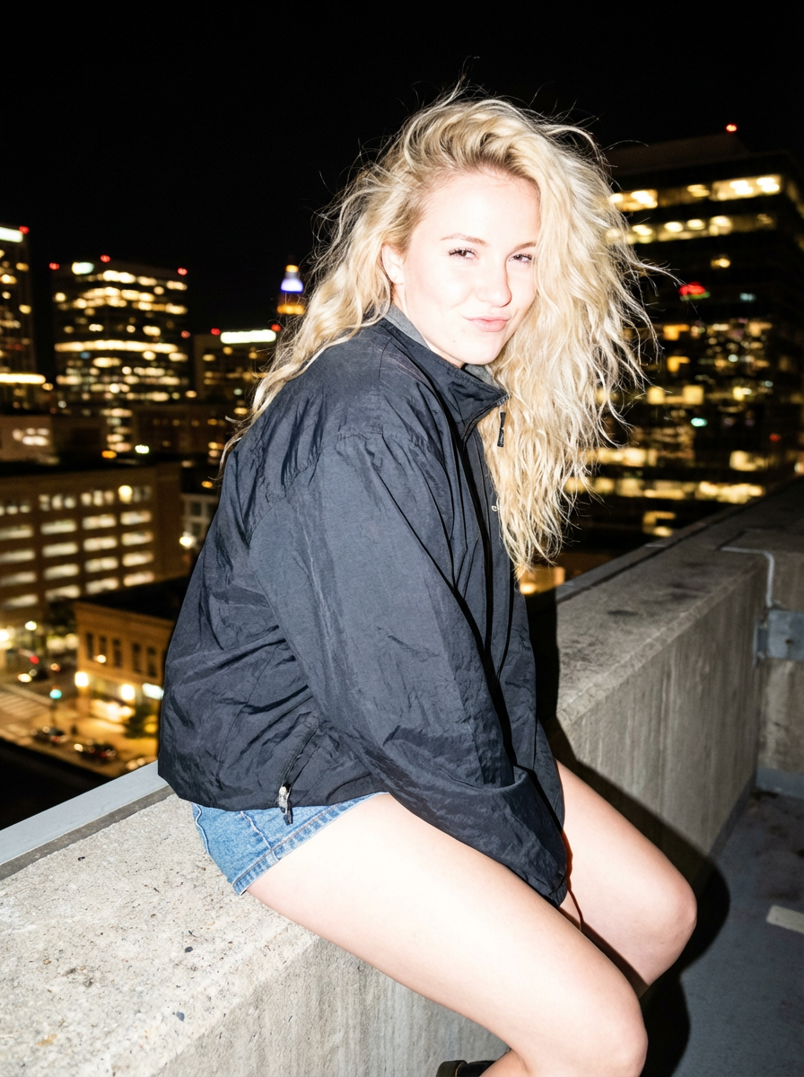 camera flash overexposed, model sitting on a rooftop at night, city lights in background. Wearing a windbreaker over denim shorts, hair blowing, sexy and adventurous . Flash foreground, city bokeh, urban adventure.