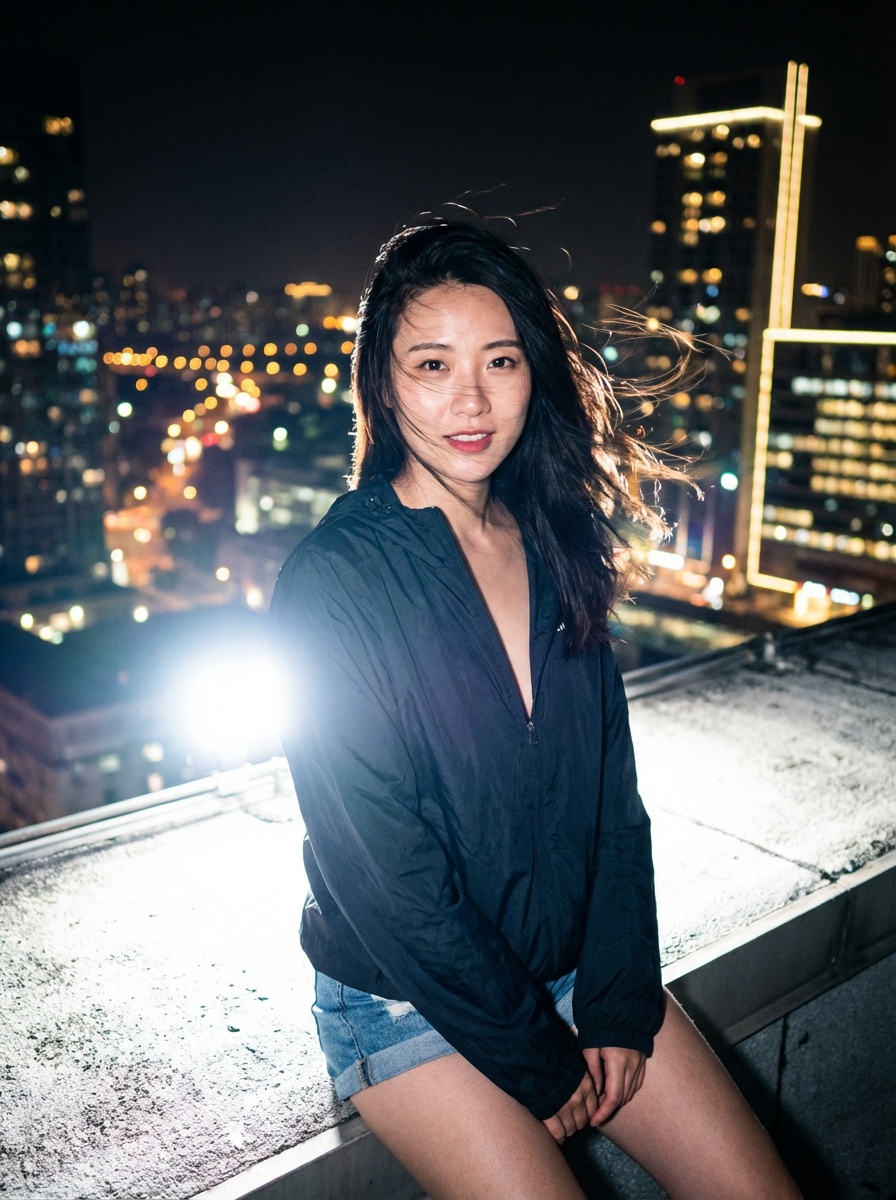 camera flash overexposed, model sitting on a rooftop at night, city lights in background. Wearing a windbreaker over denim shorts, hair blowing, sexy and adventurous . Flash foreground, city bokeh, urban adventure.