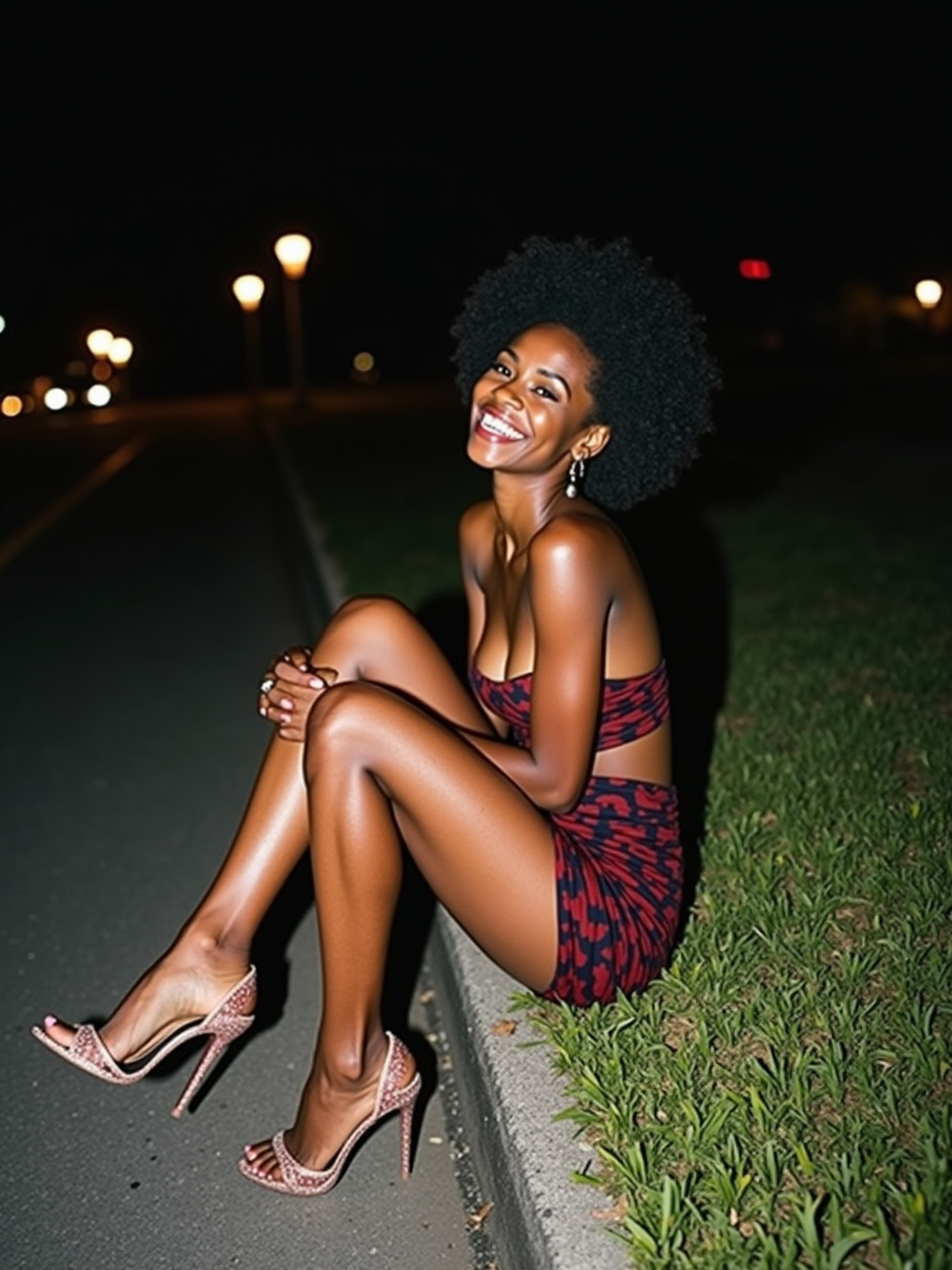 camera flash overexposed, model sitting on the curb outside a party. Wearing a short mini skirt, heels off, laughing, legs crossed, sexy posture . Night street, harsh flash, spontaneous moment.