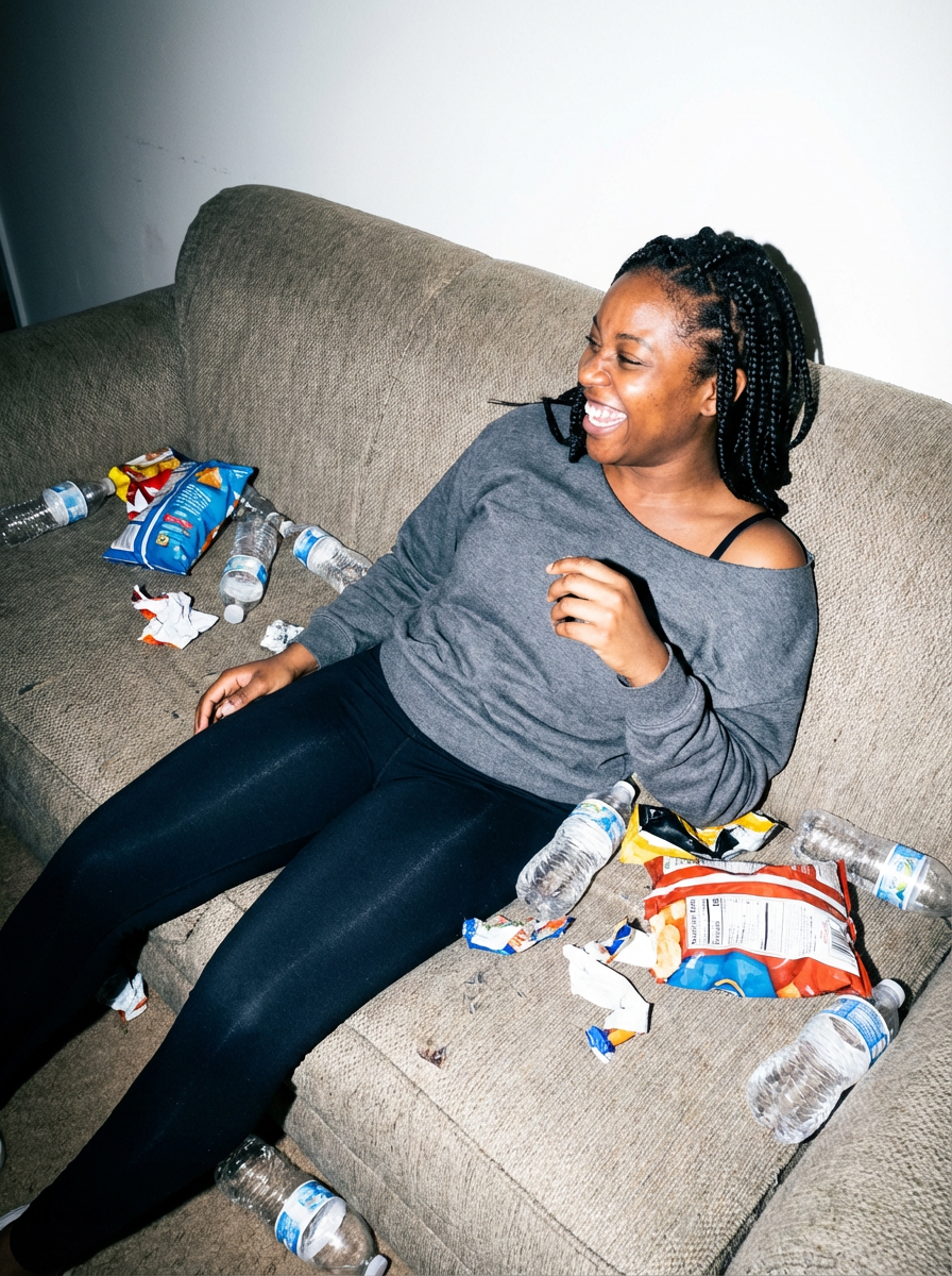 camera flash overexposed, model sprawled on a couch with snacks and empty bottles. Wearing tight leggings, laughing at something off-camera, relaxed sexy pose, top slightly off-shoulder . Flash-lit, messy, afterparty vibe.