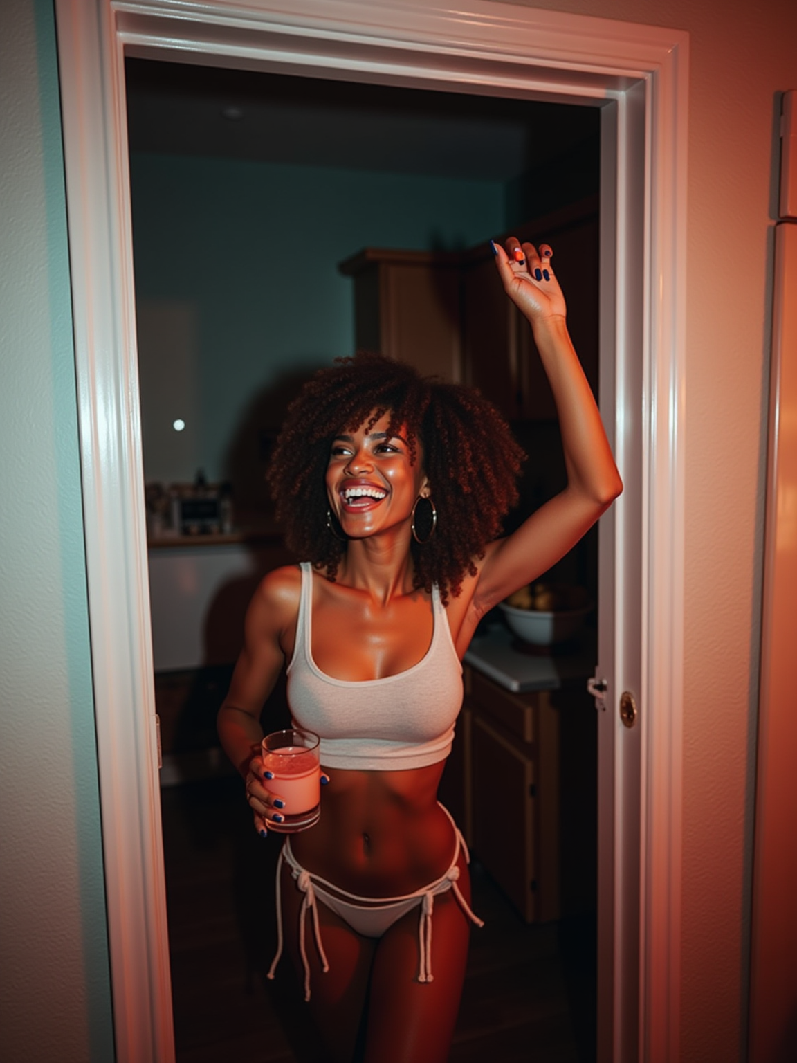 camera flash overexposed, model standing in a kitchen doorway, party in the background. Wearing a crop top, holding a drink, laughing, sexy pose, leaning in doorway . Flash, candid, house party energy.