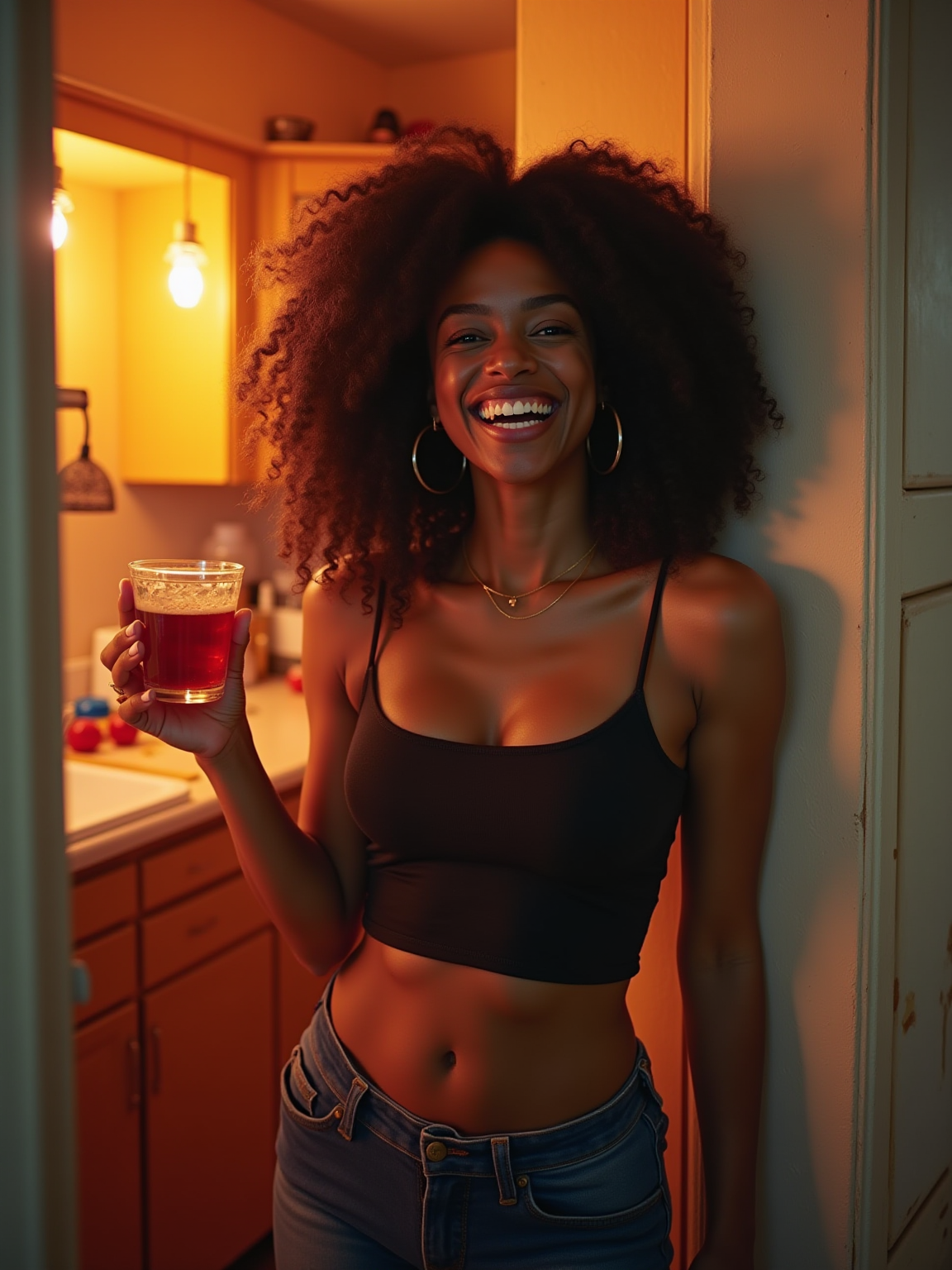 camera flash overexposed, model standing in a kitchen doorway, party in the background. Wearing a crop top, holding a drink, laughing, sexy pose, leaning in doorway . Flash, candid, house party energy.