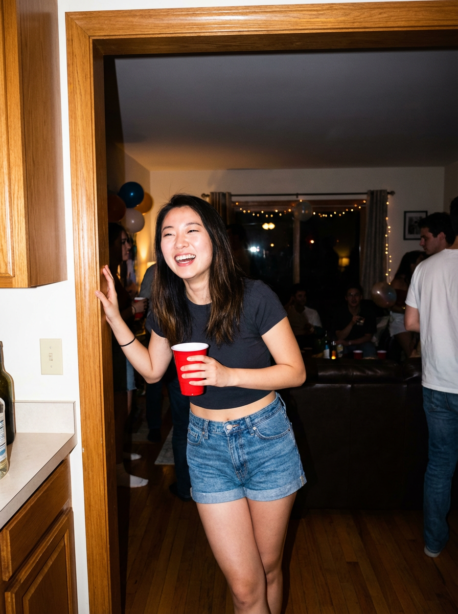 camera flash overexposed, model standing in a kitchen doorway, party in the background. Wearing a crop top, denim shorts, holding a drink, laughing, sexy pose, leaning in doorway . Flash, candid, house party energy.