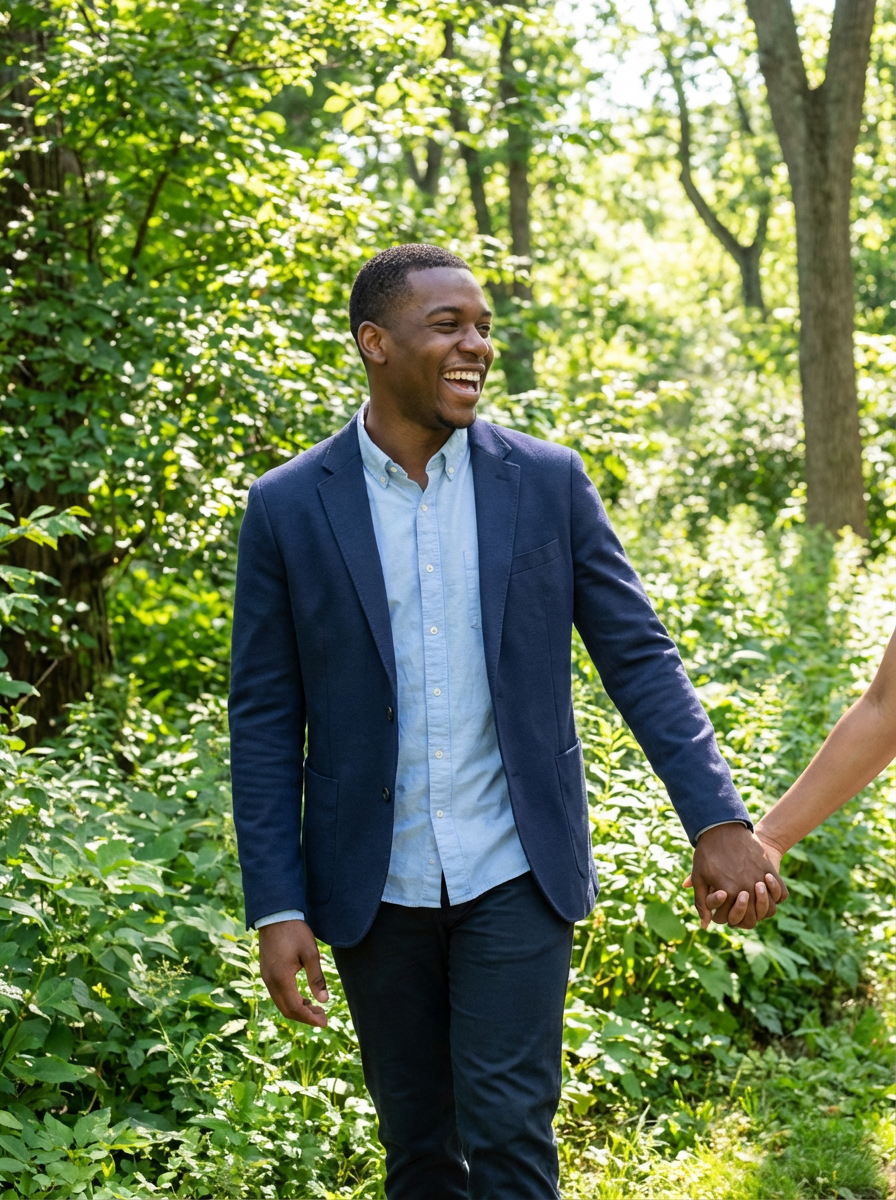 Candid engagement moment in a scenic park. Model wearing a casual blazer over a dress shirt . Laughing, walking hand in hand, surrounded by greenery.