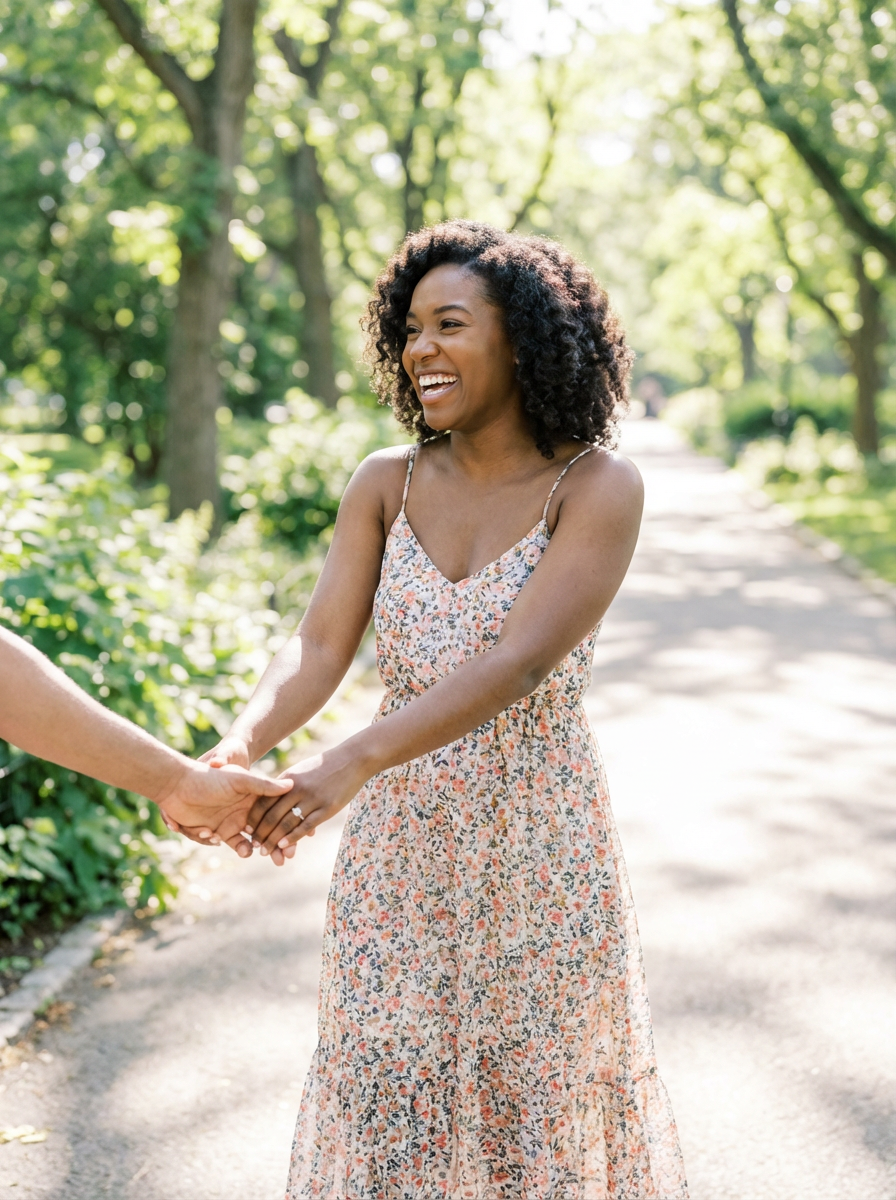 Candid engagement moment in a scenic park. Model wearing a floral dress, soft curls in hair . Laughing, walking hand in hand, surrounded by greenery.