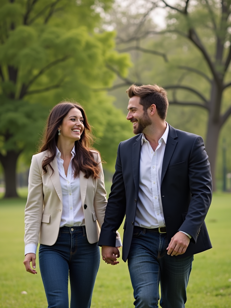 Candid engagement moment in a scenic park. Wearing a casual blazer over a dress shirt . Laughing, walking hand in hand, surrounded by greenery.
