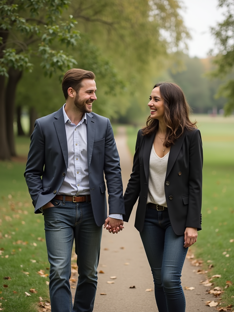 Candid engagement moment in a scenic park. Wearing a casual blazer over a dress shirt . Laughing, walking hand in hand, surrounded by greenery.