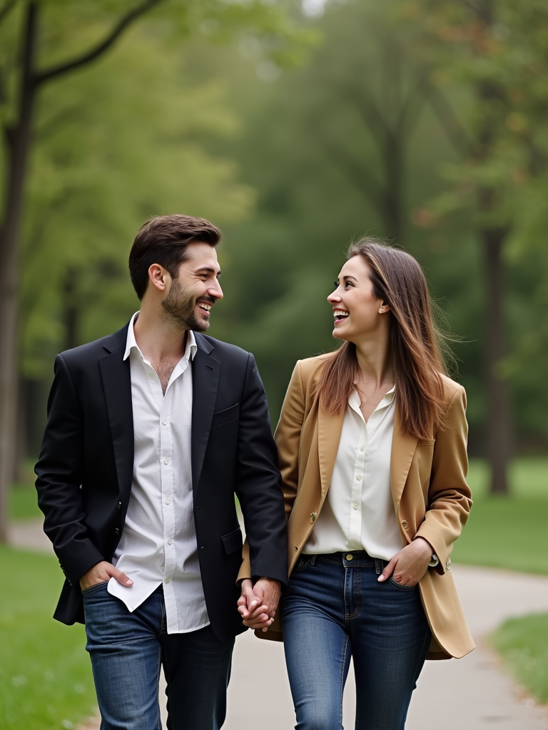 Candid engagement moment in a scenic park. Wearing a casual blazer over a dress shirt . Laughing, walking hand in hand, surrounded by greenery.