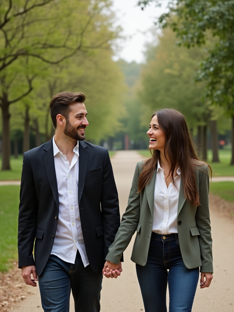 Candid engagement moment in a scenic park. Wearing a casual blazer over a dress shirt . Laughing, walking hand in hand, surrounded by greenery.
