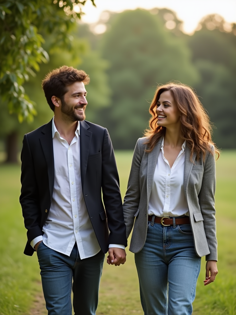 Candid engagement moment in a scenic park. Wearing a casual blazer over a dress shirt . Laughing, walking hand in hand, surrounded by greenery.