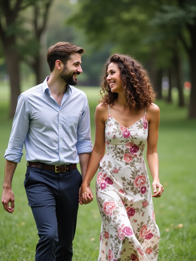 Candid engagement moment in a scenic park. Wearing a floral dress, soft curls in hair . Laughing, walking hand in hand, surrounded by greenery.