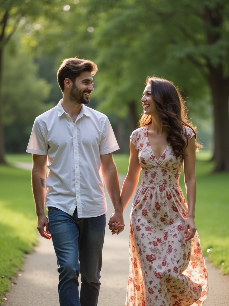 Candid engagement moment in a scenic park. Wearing a floral dress, soft curls in hair . Laughing, walking hand in hand, surrounded by greenery.