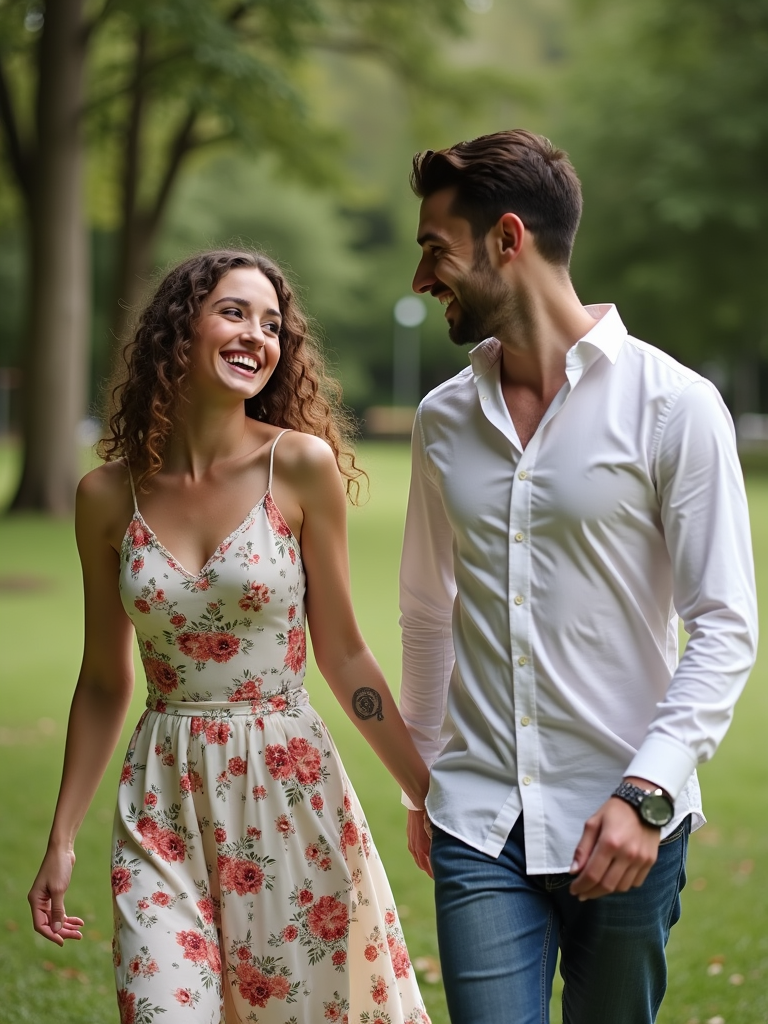 Candid engagement moment in a scenic park. Wearing a floral dress, soft curls in hair . Laughing, walking hand in hand, surrounded by greenery.