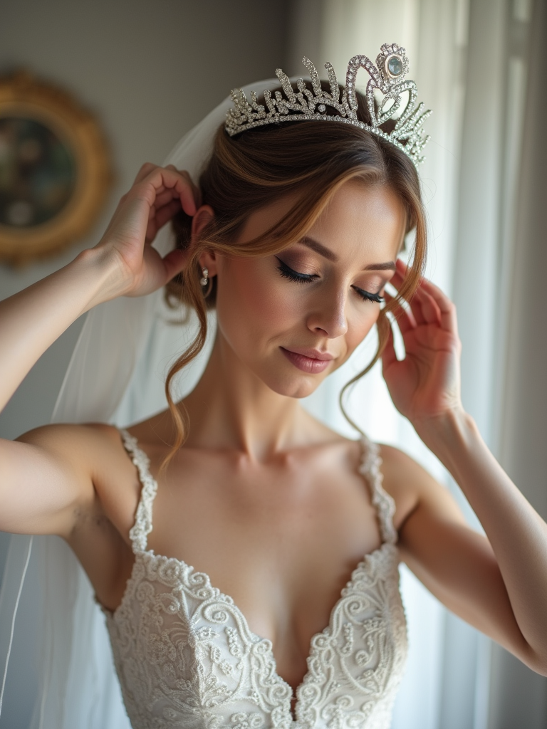 Candid moment, adjusting wedding outfit before the ceremony. Model fixing an elegant tiara, veil softly falling around shoulders . Timeless wedding aesthetic.