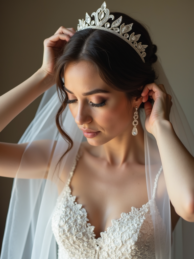 Candid moment, adjusting wedding outfit before the ceremony. Model fixing an elegant tiara, veil softly falling around shoulders . Timeless wedding aesthetic.