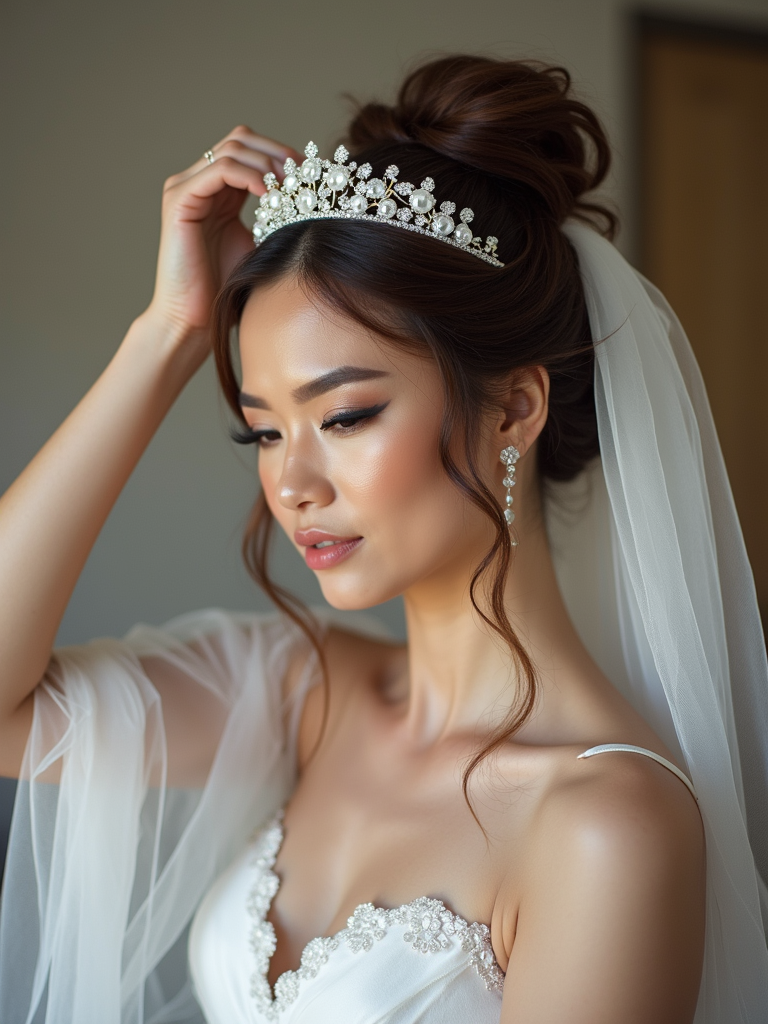 Candid moment, adjusting wedding outfit before the ceremony. Model fixing an elegant tiara, veil softly falling around shoulders . Timeless wedding aesthetic.