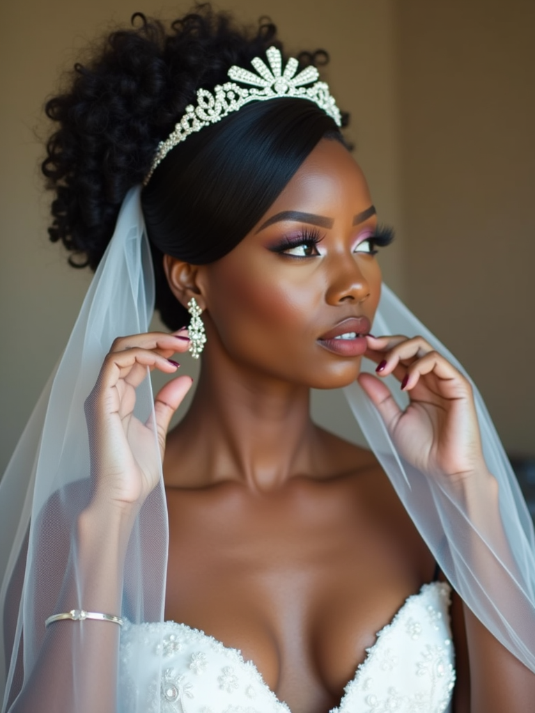 Candid moment, adjusting wedding outfit before the ceremony. Model fixing an elegant tiara, veil softly falling around shoulders . Timeless wedding aesthetic.