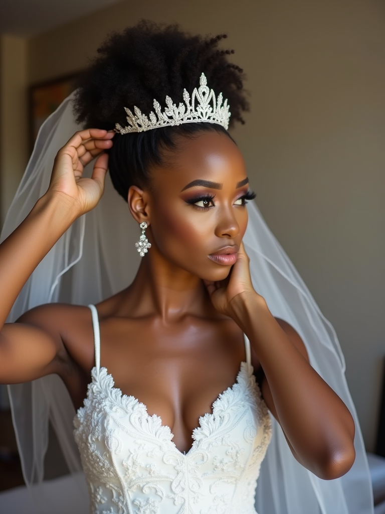 Candid moment, adjusting wedding outfit before the ceremony. Model fixing an elegant tiara, veil softly falling around shoulders . Timeless wedding aesthetic.