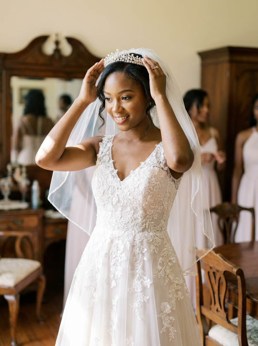 Candid moment, adjusting wedding outfit before the ceremony. Model fixing an elegant tiara, veil softly falling around shoulders . Timeless wedding aesthetic.
