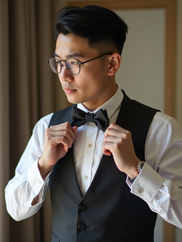 Candid moment, adjusting wedding outfit before the ceremony. Model straightening a stylish bowtie, looking dapper . Timeless wedding aesthetic.