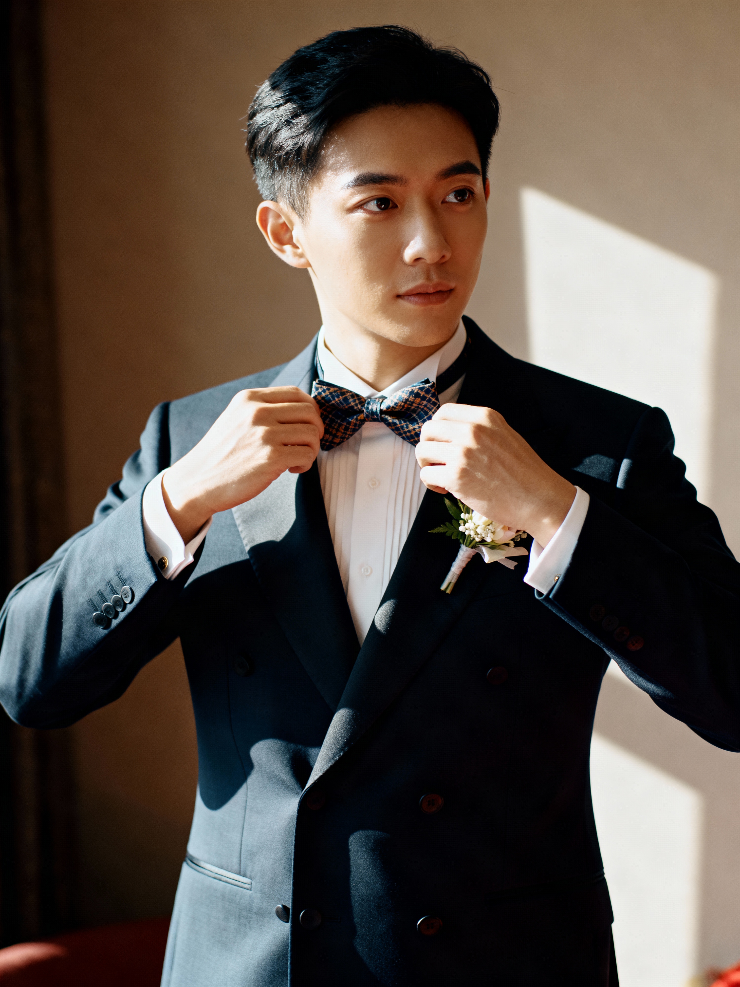 Candid moment, adjusting wedding outfit before the ceremony. Model straightening a stylish bowtie and boutonnière, looking dapper . Timeless wedding aesthetic.