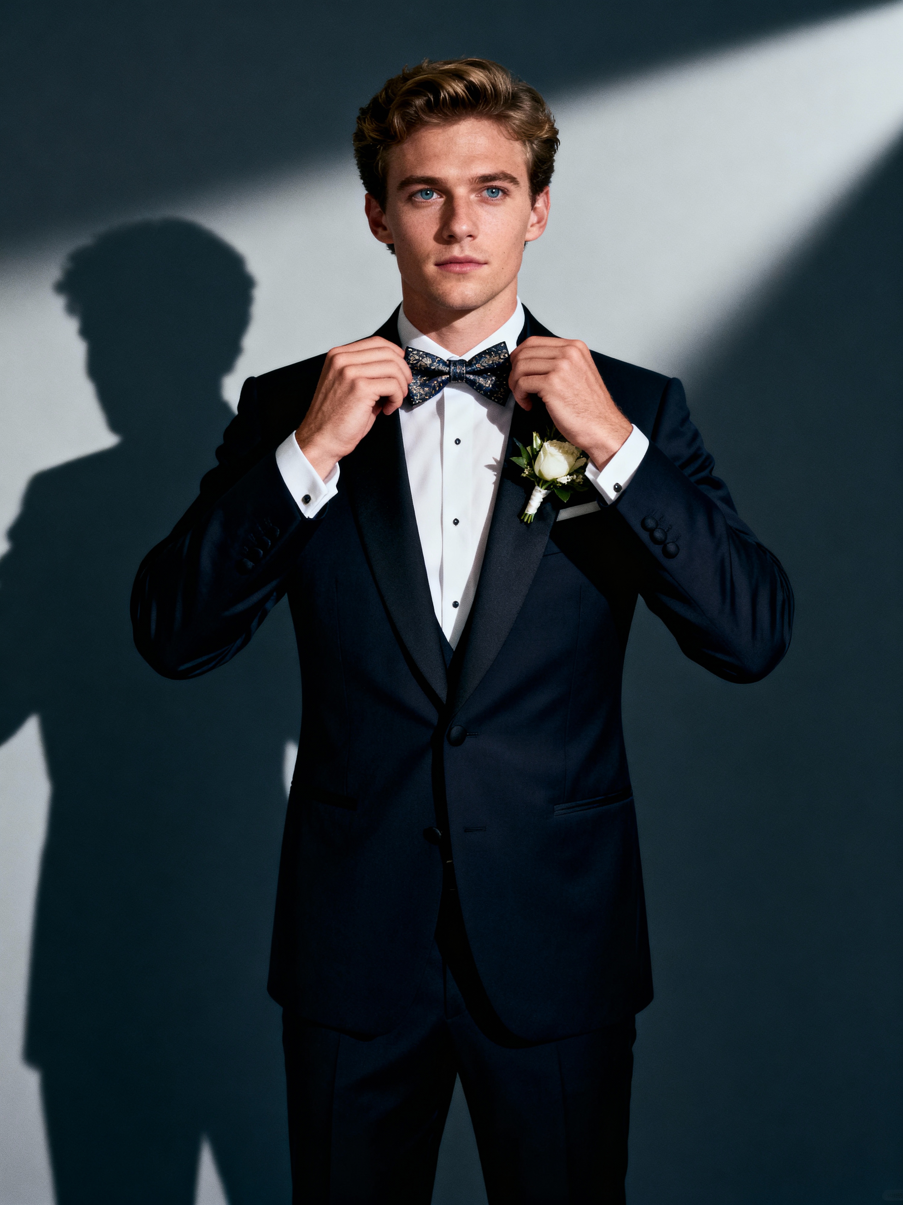 Candid moment, adjusting wedding outfit before the ceremony. Model straightening a stylish bowtie and boutonnière, looking dapper . Timeless wedding aesthetic.