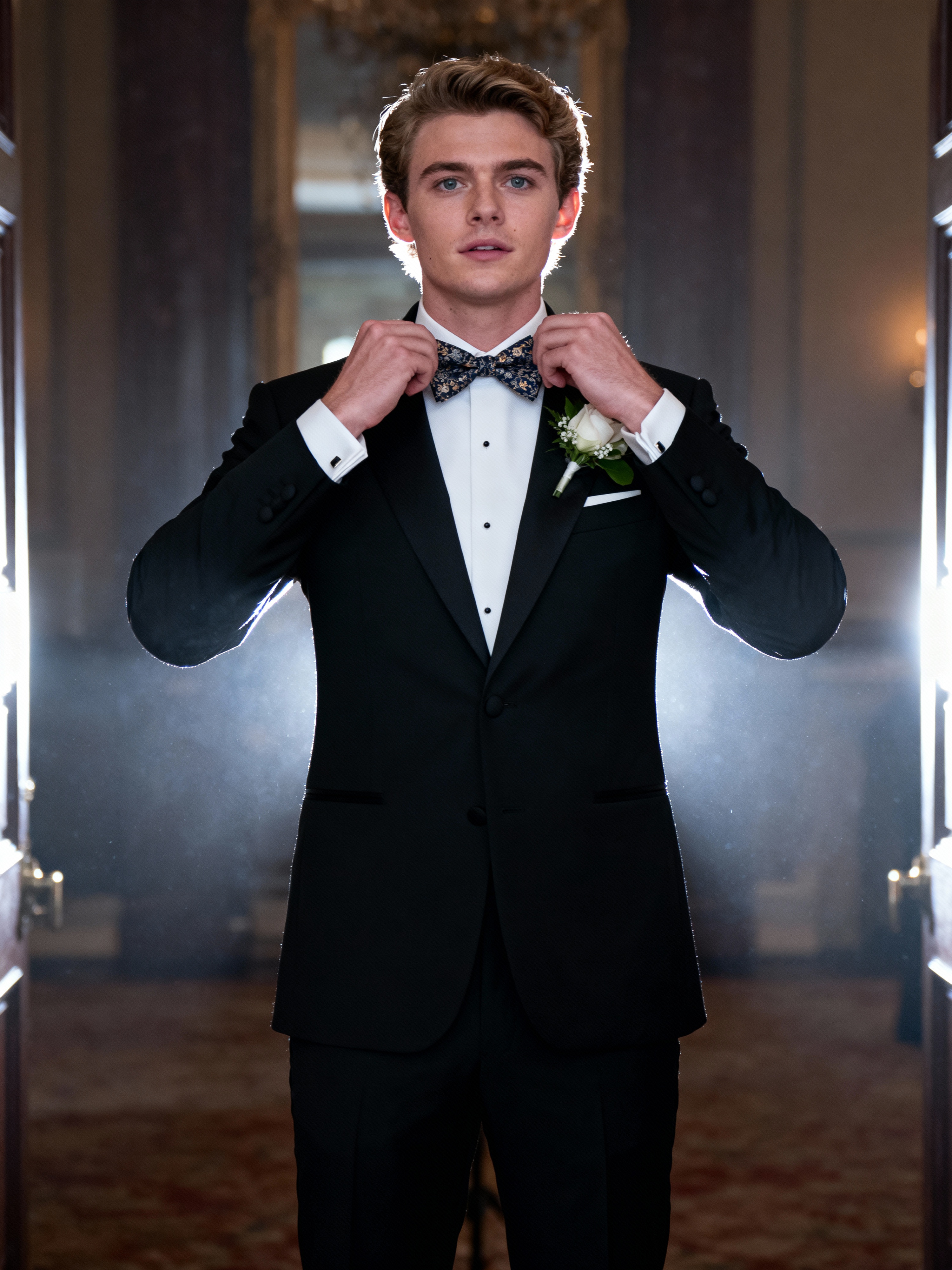 Candid moment, adjusting wedding outfit before the ceremony. Model straightening a stylish bowtie and boutonnière, looking dapper . Timeless wedding aesthetic.