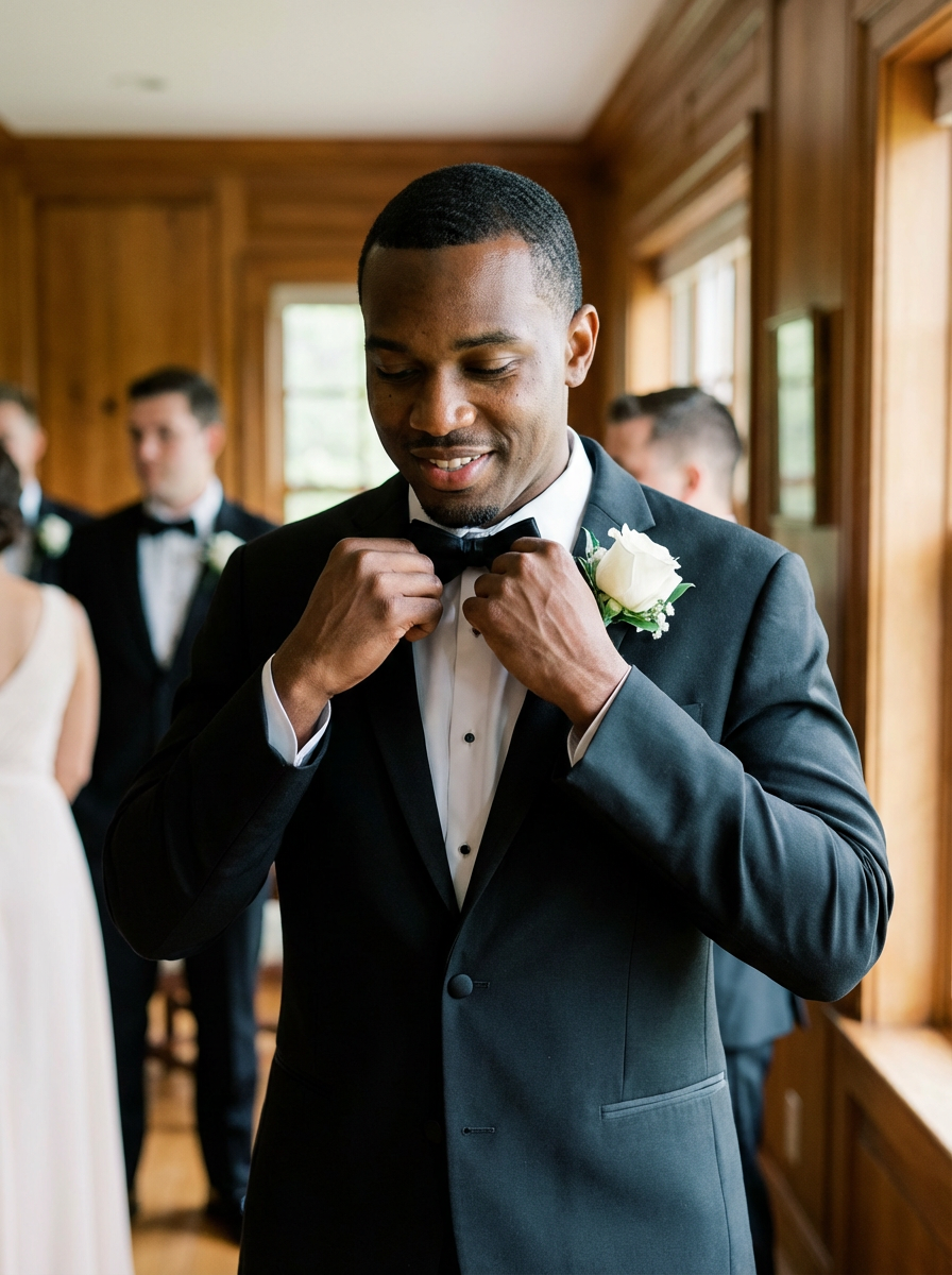 Candid moment, adjusting wedding outfit before the ceremony. Model straightening a stylish bowtie and boutonnière, looking dapper . Timeless wedding aesthetic.