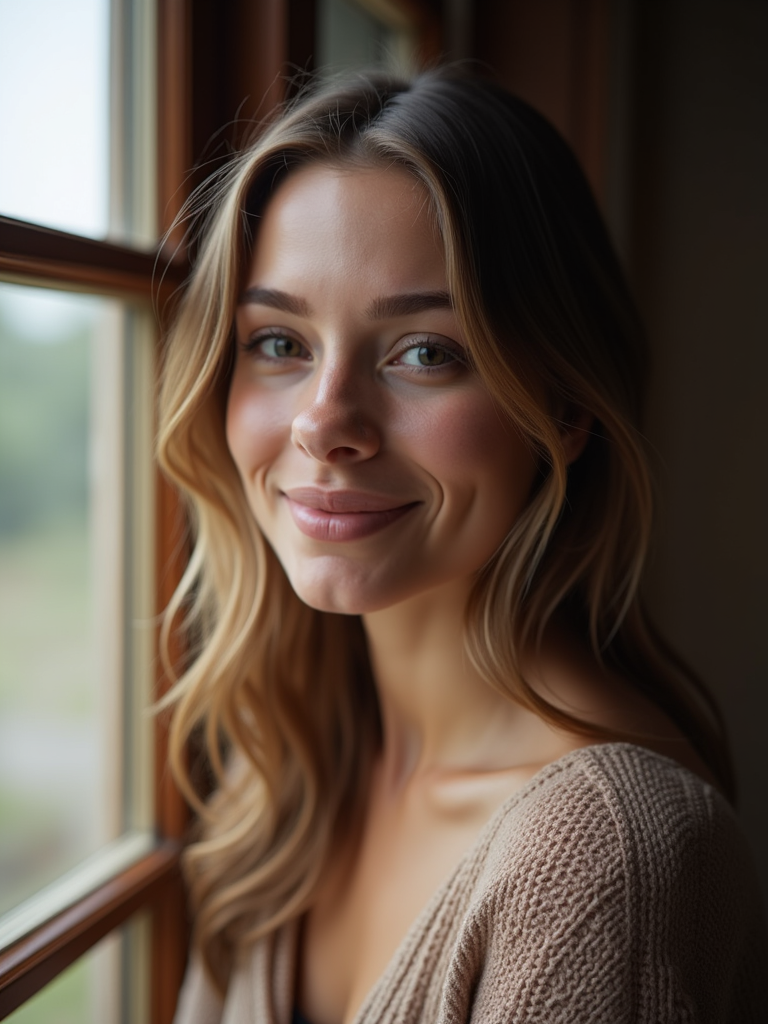 candid-style headshot of model, looking slightly off-camera, soft smile, cozy indoor setting (e.g., near a window), relaxed posture