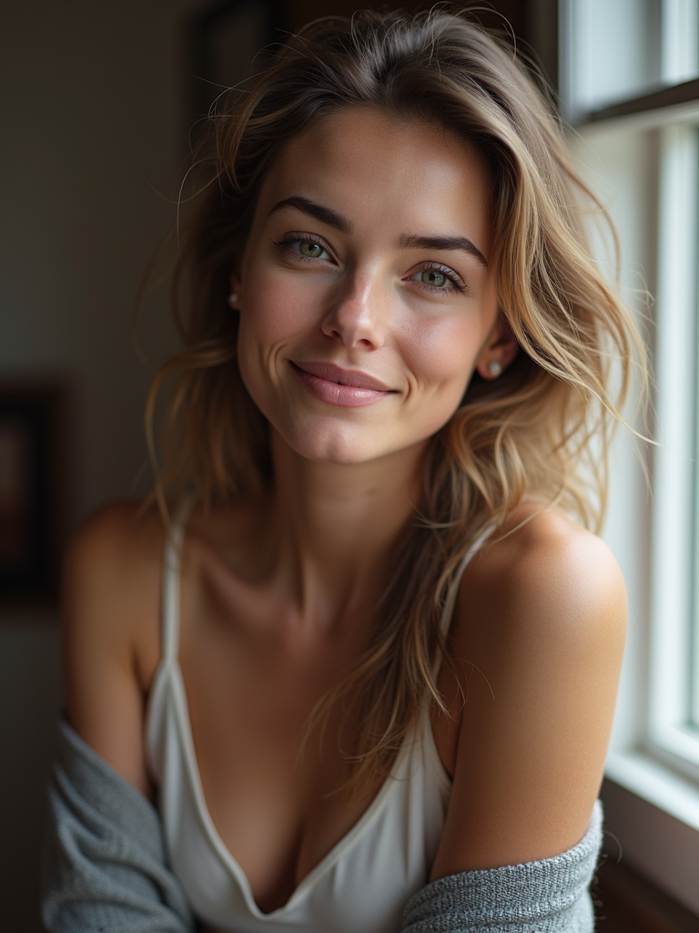 candid-style headshot of model, looking slightly off-camera, soft smile, cozy indoor setting (e.g., near a window), relaxed posture